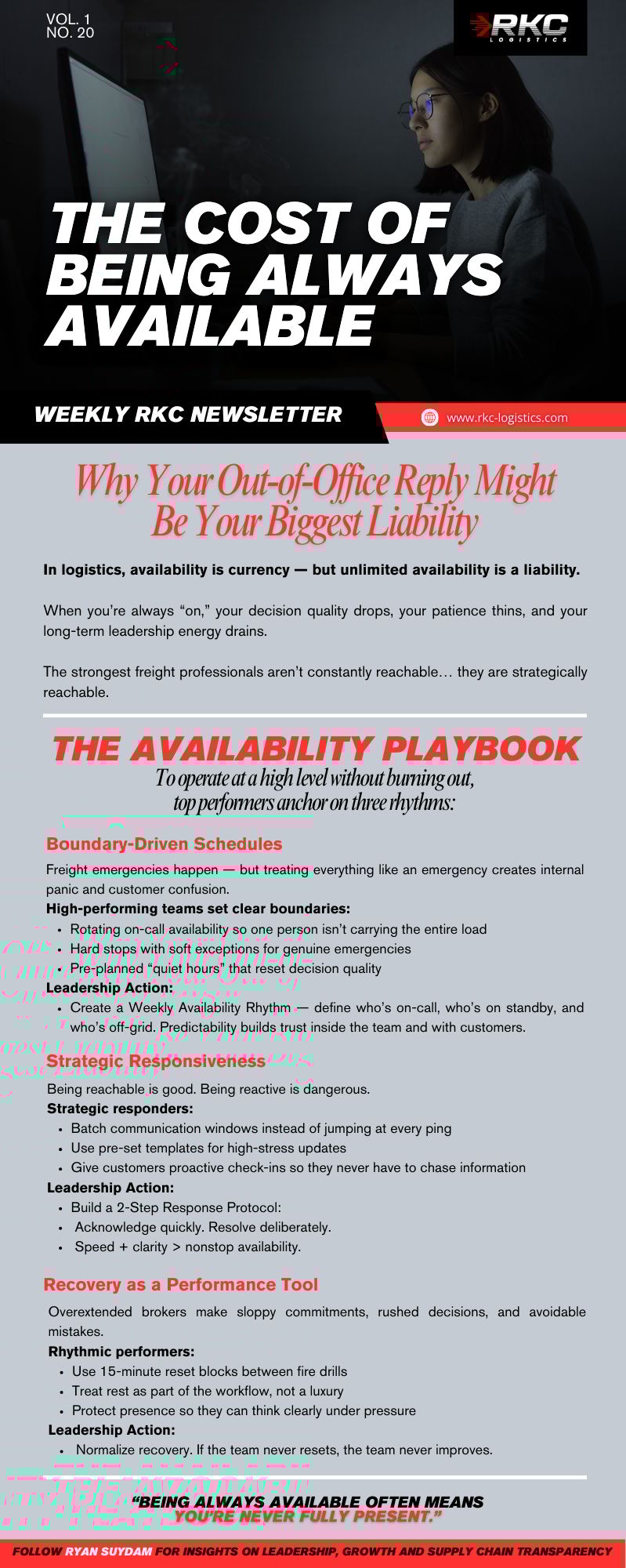 In logistics, responsiveness is expected—but constant availability comes at a cost. When every message feels urgent and every interruption demands attention, decision quality slips, leadership energy fades, and performance quietly suffers.This issue explores why being “always on” can become a hidden liability, and how high-performing freight leaders stay effective by designing availability with intention. The goal isn’t less commitment—it’s smarter responsiveness that protects clarity, trust, and long-term results.
