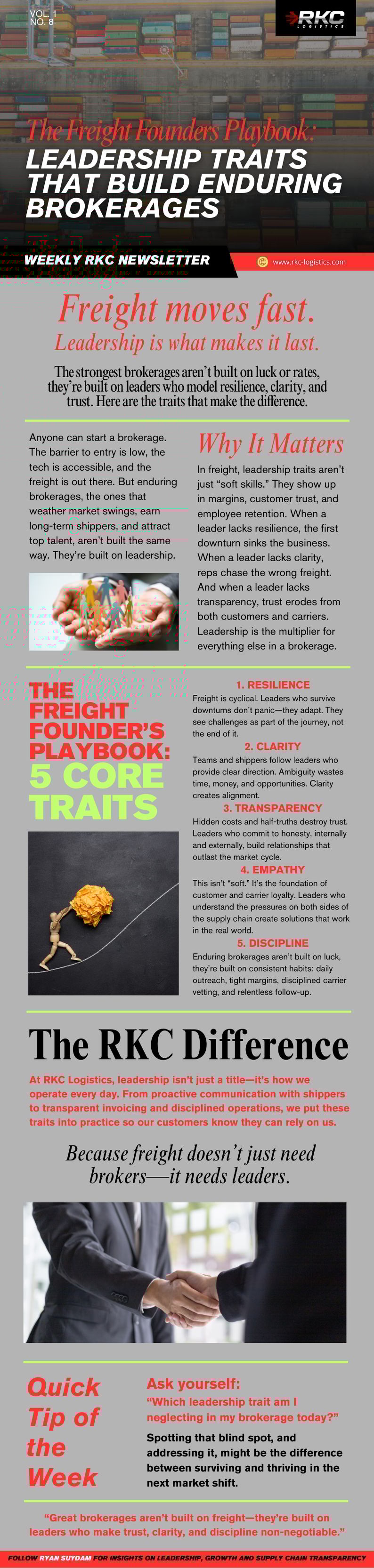 Too many brokerages rely on luck, low rates, or market timing. But the truth is, enduring brokerages are built on something deeper: leaders who embody resilience, clarity, transparency, empathy, and discipline. These traits aren’t “soft skills”—they’re the backbone of trust, retention, and long-term growth. In this issue, we’ll break down the leadership playbook and show why it matters more than ever.