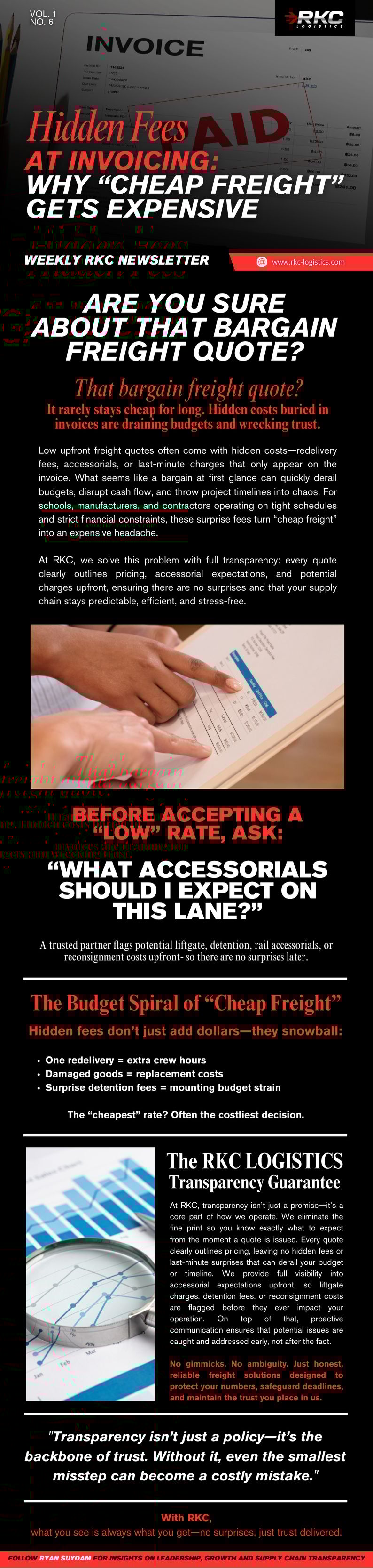 A low rate on paper often hides the most expensive surprises in freight.Hidden fees derail budgets, disrupt timelines, and destroy trust. At RKC, what you see is what you get—no surprises, just honest freight solutions built on transparency.At RKC, transparency isn’t just a policy, it’s the backbone of trust. We eliminate fine print by outlining every detail upfront: clear pricing, accessorial expectations, and potential charges before they ever hit your bill. With proactive communication layered in, you’re protected from surprises and free to plan with confidence.