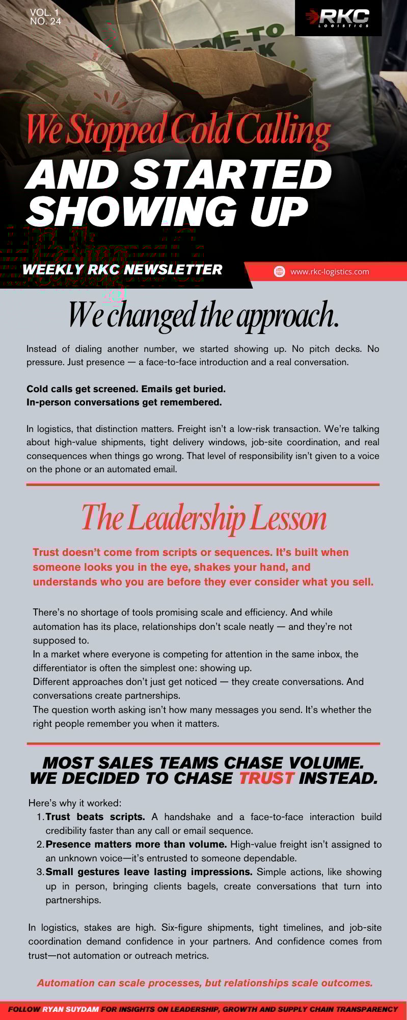 We stopped chasing volume and started building trust.Instead of another cold call or automated sequence, we showed up—face to face, no pitch, no pressure. In logistics, where six-figure shipments and tight timelines leave no room for error, trust isn’t built through scripts. It’s built through presence.This issue breaks down why relationships still outperform automation, why being remembered matters more than being seen, and how a simple shift in approach created real conversations—and real partnerships.Because in a crowded inbox, the people who show up are the ones who get trusted.